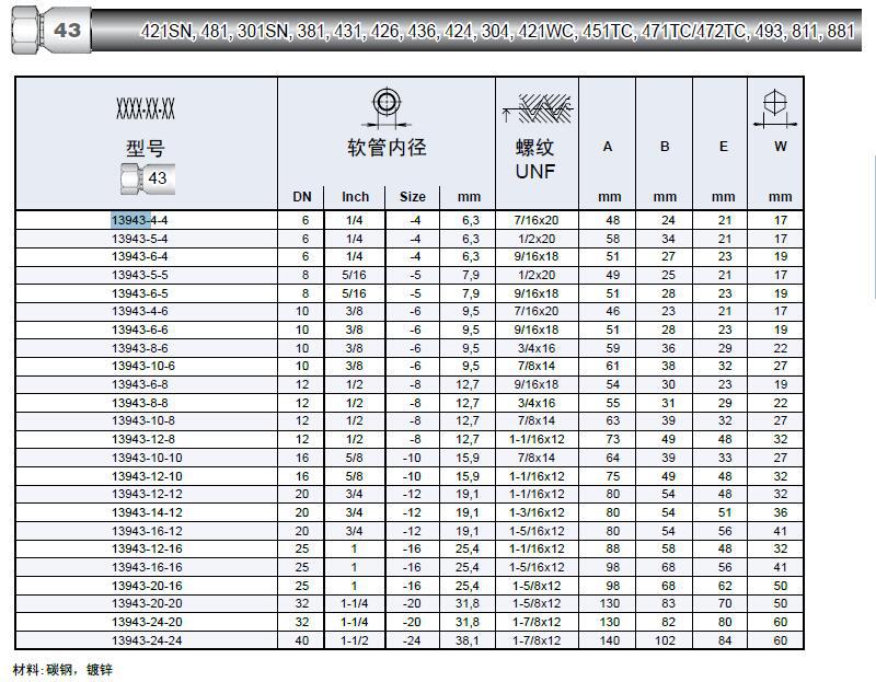 派克软管接头的材料包括碳钢、铜以及不锈钢,尺寸范围从3/16”至3”。另外,派克软管接头还有多种尾端连接形式,如DIN,ORFS,BSP,SAE,法兰等。