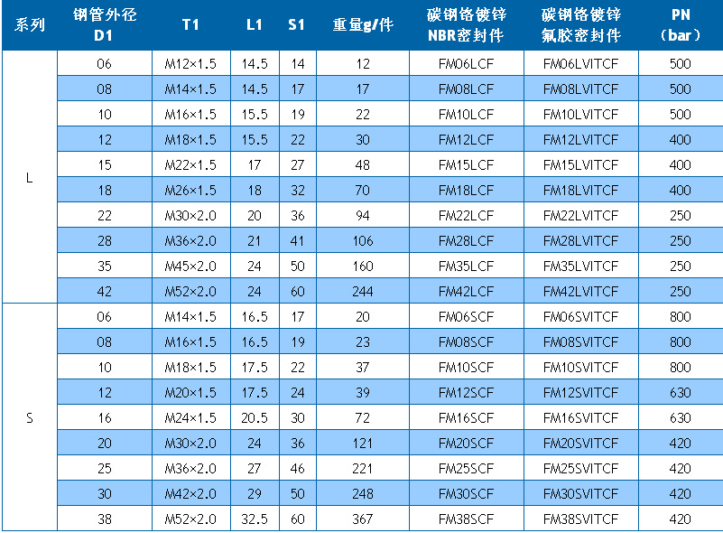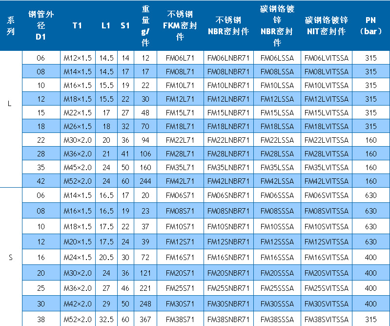 接头系列:LL超轻型(压力100bar)、L轻型(160-500bar)、S重型(315-800bar)