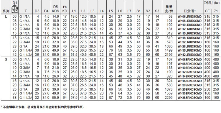 接头系列:LL超轻型(压力100bar)、L轻型(160-500bar)、S重型(315-800bar)