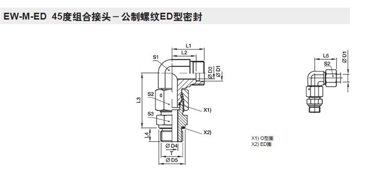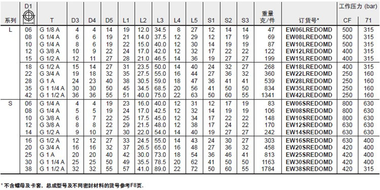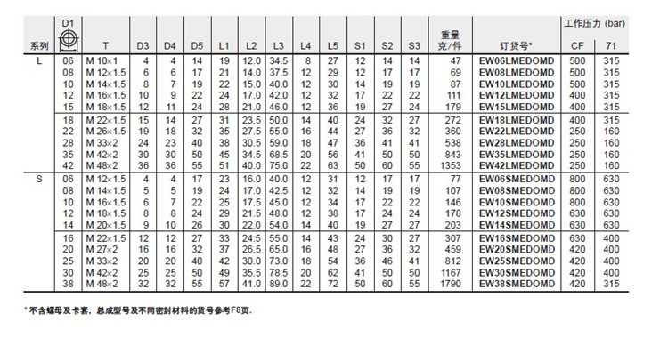 接头系列:LL超轻型(压力100bar)、L轻型(160-500bar)、S重型(315-800bar)