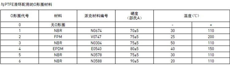 滑动环: Polon®052,改性的PTFE+40%青铜。O形圈: N0674,邵氏硬度约为70的NBR橡胶。若有特殊要求(压力、温度、速度等),请与本公司的咨询服务部联系,他们会向你推荐合适的材料和结构。