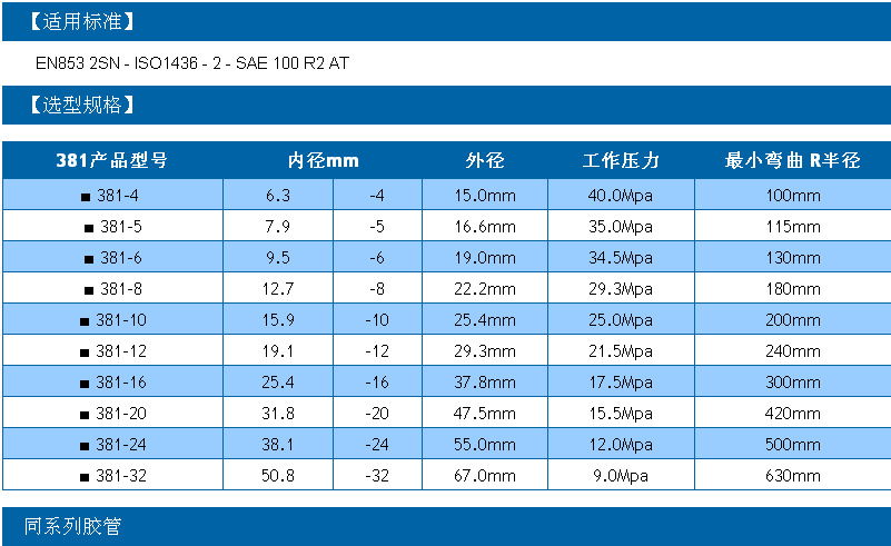 石油基液压油,水乙二醇液压油,润滑油,空气和水,用于1.7Mpa以上空气,软管需要针刺。具体化学兼容性见 《化学性兼容性表》。