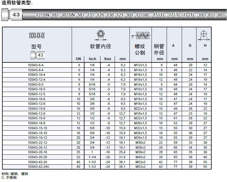 派克软管接头的材料包括碳钢、铜以及不锈钢,尺寸范围从3/16”至3”。另外,派克软管接头还有多种尾端连接形式,如DIN,ORFS,BSP,SAE,法兰等。