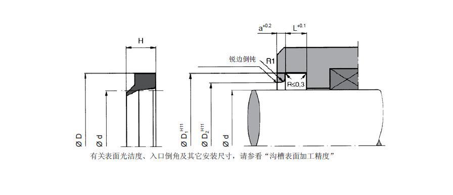 A5型防尘圈容易装入结构相当简单的沟槽中。应避免防尘圈唇口与活塞杆孔眼或其它连接零件相接触。但是防尘圈最好装在壳体外,这样挡出的污物容易清除。若有特殊要求(温度、速度、用于水、HFA液、HFB液等介质中),