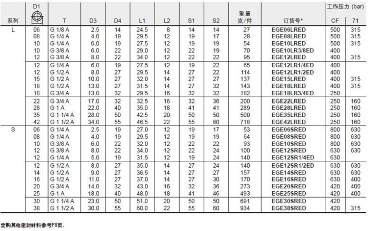 接头系列:LL超轻型(压力100bar)、L轻型(160-500bar)、S重型(315-800bar)