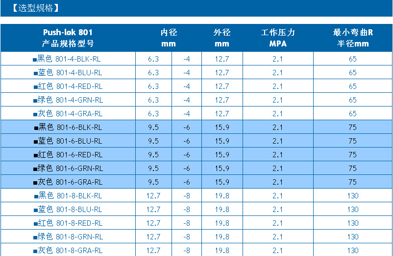 Parker 801系列的软管广泛应用于工业的各种场合:从机器人、自动化、仪器仪表、水输送、水冷系统、汽车、CRH、CNC、化工等等场合都可以看到它们的身影。