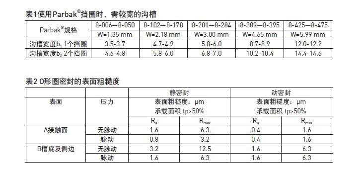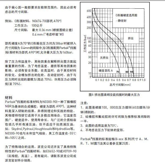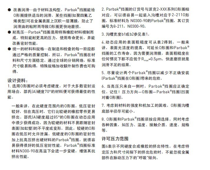 派克Parbak®挡圈是压力密封件(如O型圈)的补充、其本身并不是密封,使用挡圈的主要原因是减少O型圈及类似密封件低压侧的间隙。O型圈加挡圈的结构将承受比单独O型圈时大得多的压力。派克Parbak®挡圈由于多方面的原因而极为显著。首先,派克Parbak®挡圈用高硬度橡胶材料模压成一个不间断的圆环,通过拉伸很容易装配:由于派克Parbak®挡圈既不是切口式,也不是螺旋式。所以不会引起O型圈局部的损坏,其它类型挡圈无此特点。
