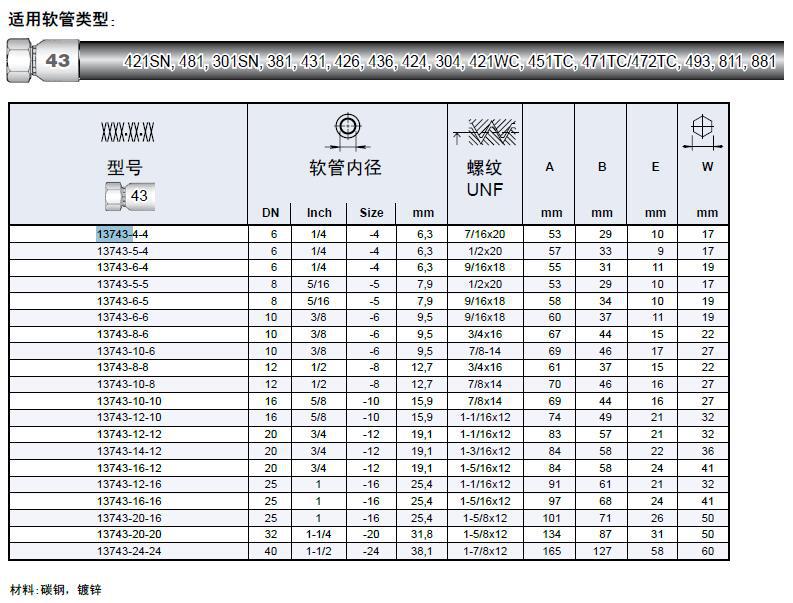 派克软管接头的材料包括碳钢、铜以及不锈钢,尺寸范围从3/16”至3”。另外,派克软管接头还有多种尾端连接形式,如DIN,ORFS,BSP,SAE,法兰等。