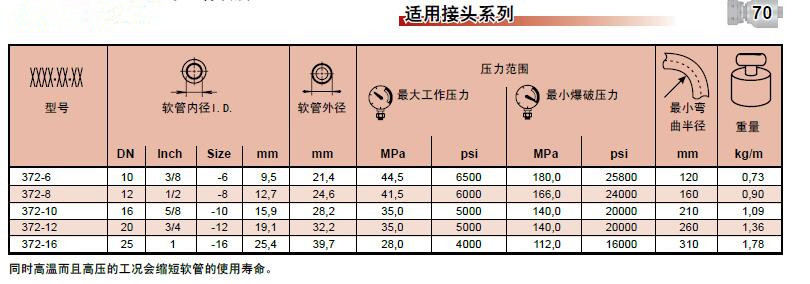 石油基液压油及水乙二醇液压油,润滑油,空气和水。用于压力在1,7MPa以上压缩气体场合,软管应先针刺。