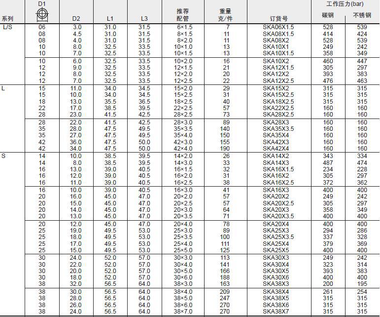 接头系列:LL超轻型(压力100bar)、L轻型(160-500bar)、S重型(315-800bar)