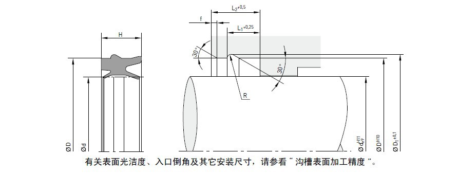 顺着凹进的环形槽,EU 型活塞密封防尘圈被推进沟槽里。在装配中,避免唇部被锐边损伤。