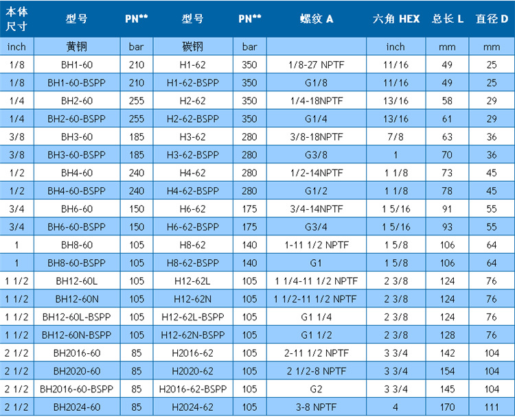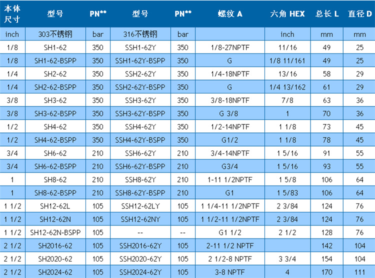 • 可选碳钢、黄铜、303不锈钢、316不锈钢材料