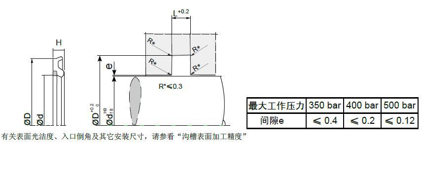 这类密封件应有轴向间隙(参看表中H和L)。为了避免密封唇口的损坏,安装时不要将密封件在锐边上拉动这类密封件通常都可以装入闭式沟槽中。在入口处受限制时,要用特殊的安装工具。用户如有要求,本公司将提供类工具的设计方案,公差准则为H8/f7。
